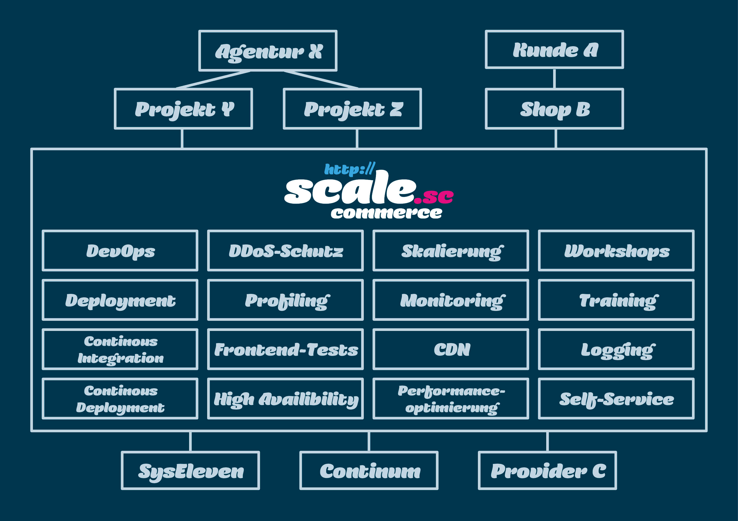 Bei ScaleCommerce gibt es kein Vendor-Lockin: Alle Komponenten, die wir standardmäßig einsetzen und empfehlen, können Sie frei nutzen. Für Sie bedeutet das null Risiko und die Möglichkeit, jederzeit alle durchgeführten Optimierungen auch ohne uns weiter nutzen zu können. Wir glauben daran, dass Sie begeistert sind von unserem Support und bei uns bleiben wollen, weil Sie kompetente Ansprechpartner schätzen. Dazu brauchen wir Sie nicht zu zwingen.